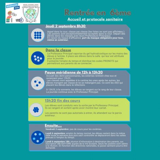 Vous trouverez ci-dessous les horaires de rentrée pour le lundi 1er septembre (6ème) et le mardi 2 septembre (5ème, 4ème et 3ème).